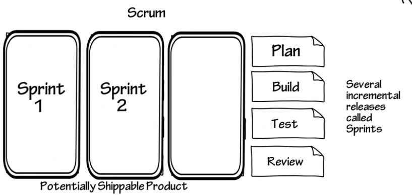 SCRUM = iteration of Plan, build, test, review